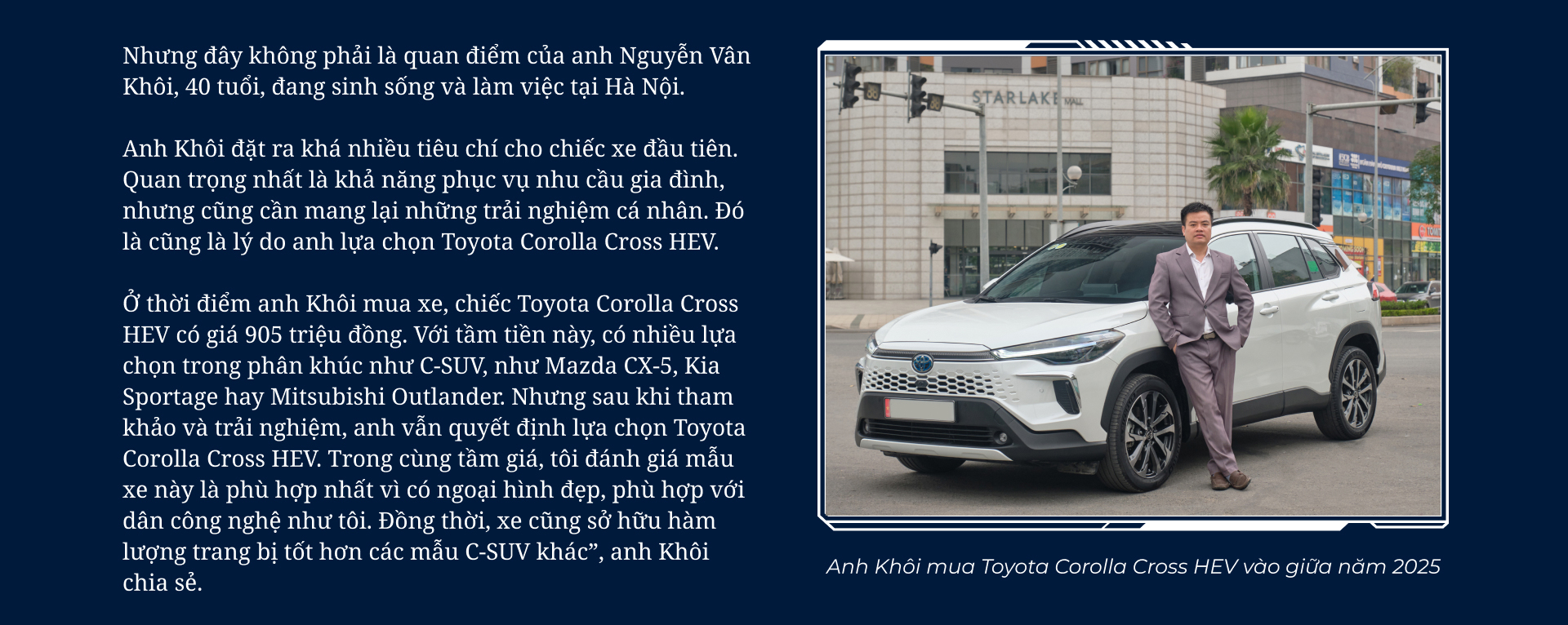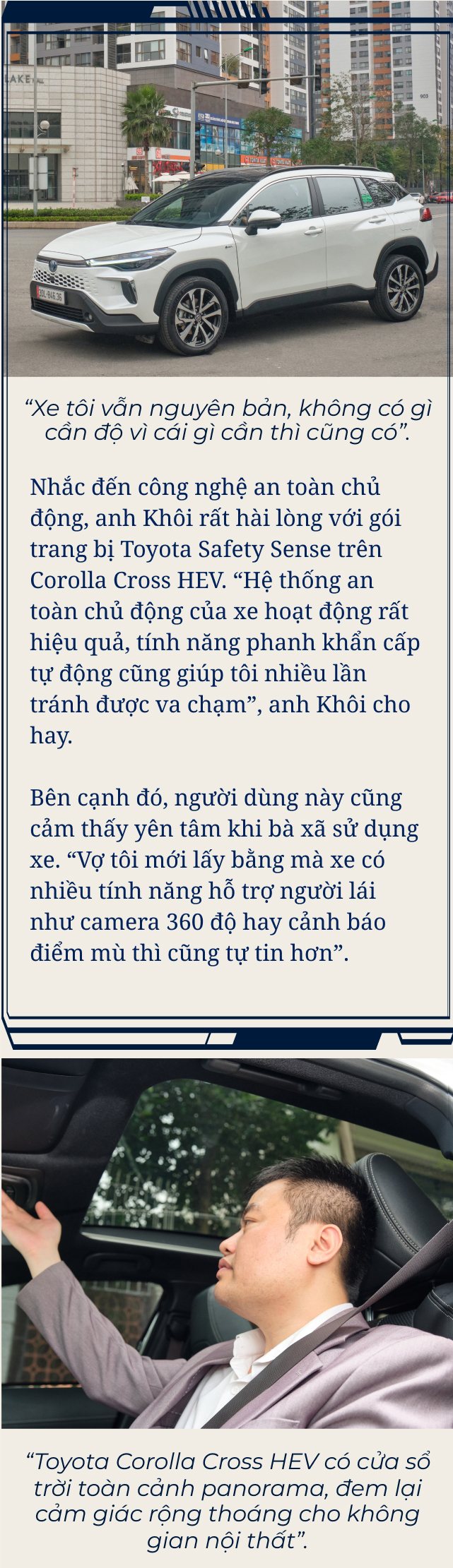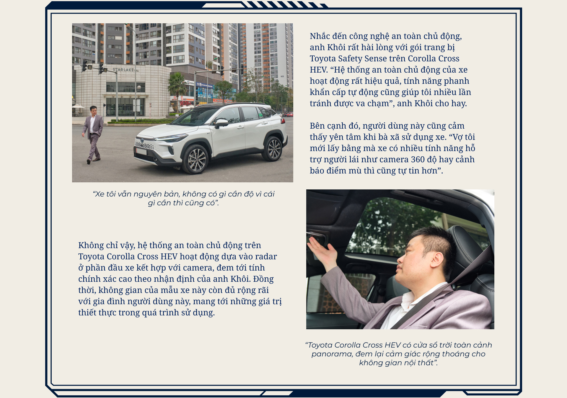 Theo anh Khôi, việc chấp nhận chi thêm tiền để mua bản hybrid của Toyota Corolla Cross cho phép anh “tận hưởng trang bị của bản full, đi sướng hơn, êm ái hơn nhờ sự hỗ trợ của mô-tơ điện”.